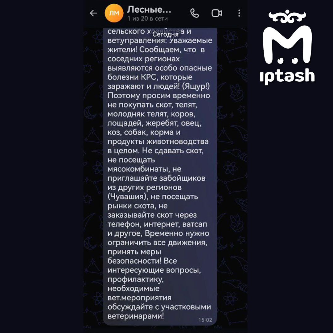 Сообщение о новых правилах людям разослали в мессенджере. Скриншотом с нами поделился житель села Лесные Моркваши. Говорит, запрет выдали Управления сельского хозяйства и ветеринарное управления. Мы позвонили главврачу районного ветобъединения — он подтвердил информацию. В ближайшее время такие же меры могут ввести во всей республике — распоряжение властей сейчас проходит антикоррупционную проверку. Вирус уже бушует в соседней Чувашии.