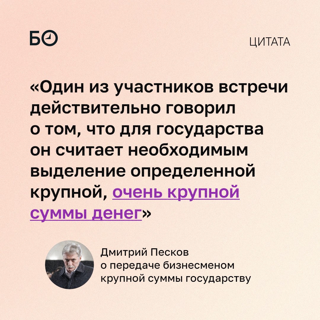 На встрече с Владимиром Путиным один из бизнесменов сам решил перевести государству очень крупную сумму. Это было его личное, семейное решение, уточнил Дмитрий Песков.