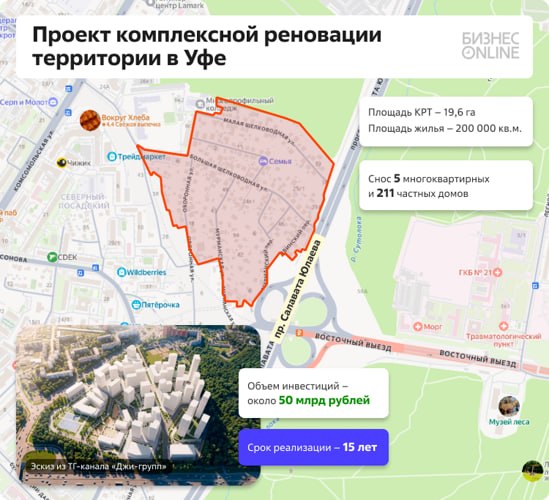 «Что такое КРТ? Ты получаешь площадку под застройку, но должен расселить дома на ней, то есть это рыночная стоимость земли плюс стоимость изымаемого имущества, которую компенсирует застройщик. Это уже может быть неподъемная цифра», — оценивают эксперты риски комплексной реновации. Девелопер с казанскими корнями («Унистройрегион-4» — входит в ГК «Унистрой») из топ-25 застройщиков России выкупил с торгов право застройки в Уфе территории в 19,6 га. Застройщик предложил 185,9 млн рублей при стартовой цене в 8,6 млн. Плановый объем инвестиций — более 50 млрд.