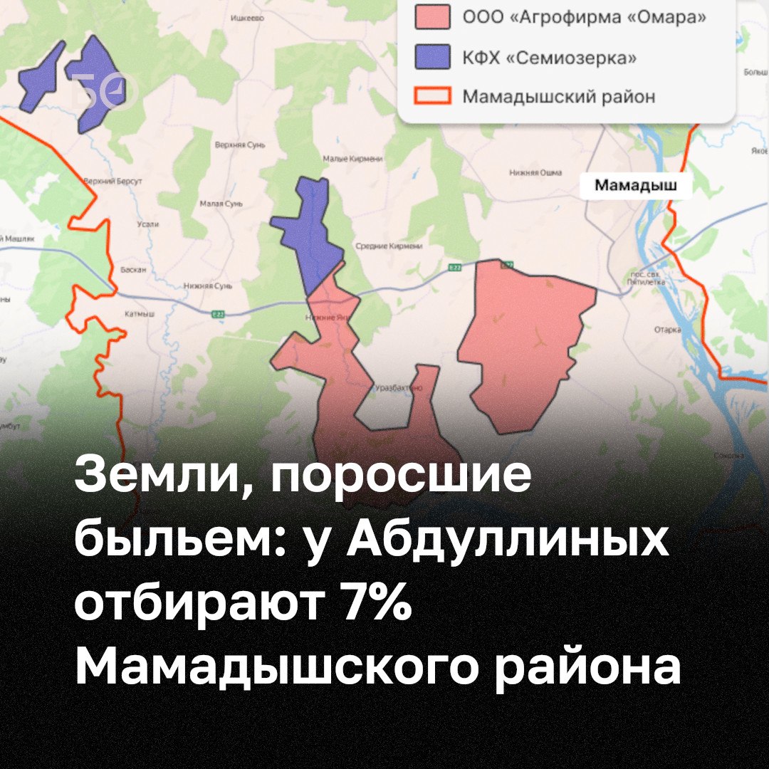 Россельхознадзор инициировал изъятие почти 16 тыс. га у компании, подконтрольной семье известных в Татарстане бизнесменов — бывшего исполнительного директора Госжилфонда Талгата Абдуллина и экс-предправления Алтынбанка Рината Абдуллина. Формальных оснований для этого достаточно: земли не обрабатывались более трех лет, заросли сорняками, а предписания ведомства собственники систематически игнорировали. Если суд удовлетворит иск, участки выставят на публичные торги.