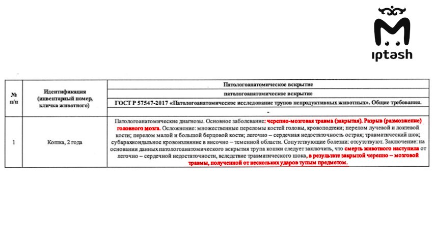 Уже в полиции Ленар признался: всё-таки бил. Но когда вышвырнул кошку из грузовика, та ещё якобы была жива. Её тело нашли неподалёку и отправили на экспертизу в Нижний Новгород. Она показала, что смерть наступила от сердечно-лёгочной недостаточности, вызванной закрытой черепно-мозговой травмой. От ударов тупым предметом по голове.