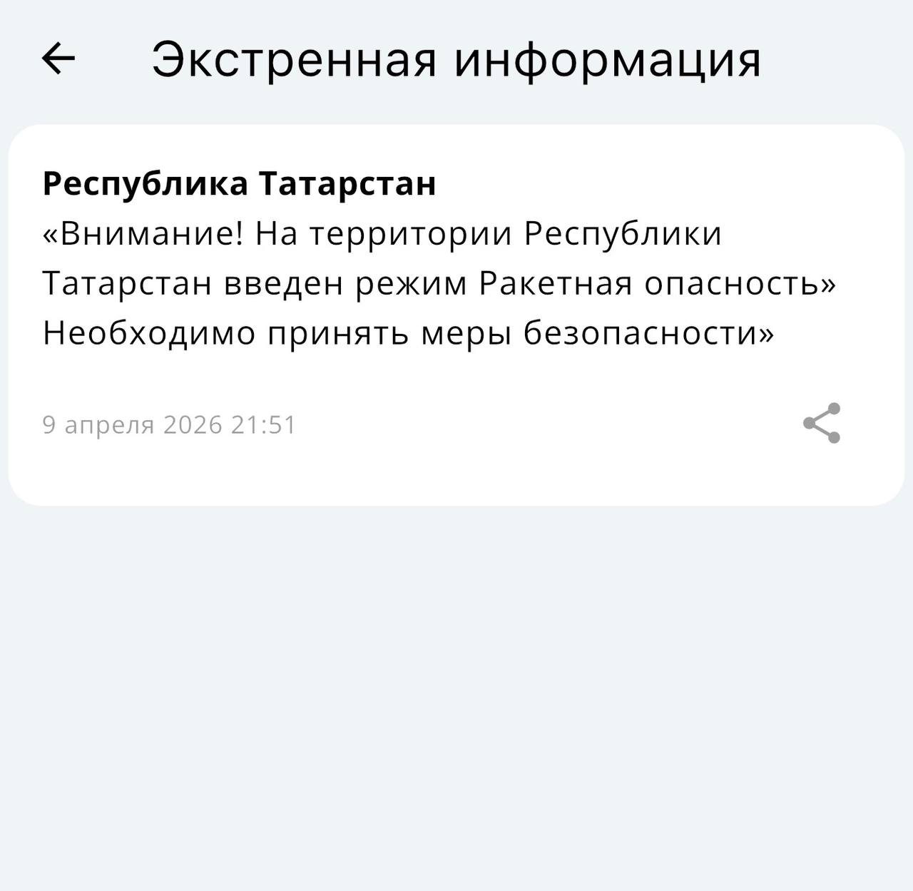Внимание! На территории Республики Татарстан объявлен режим «Ракетная опасность». Необходимо принять меры безопасности.Следите за оповещениями МЧС!