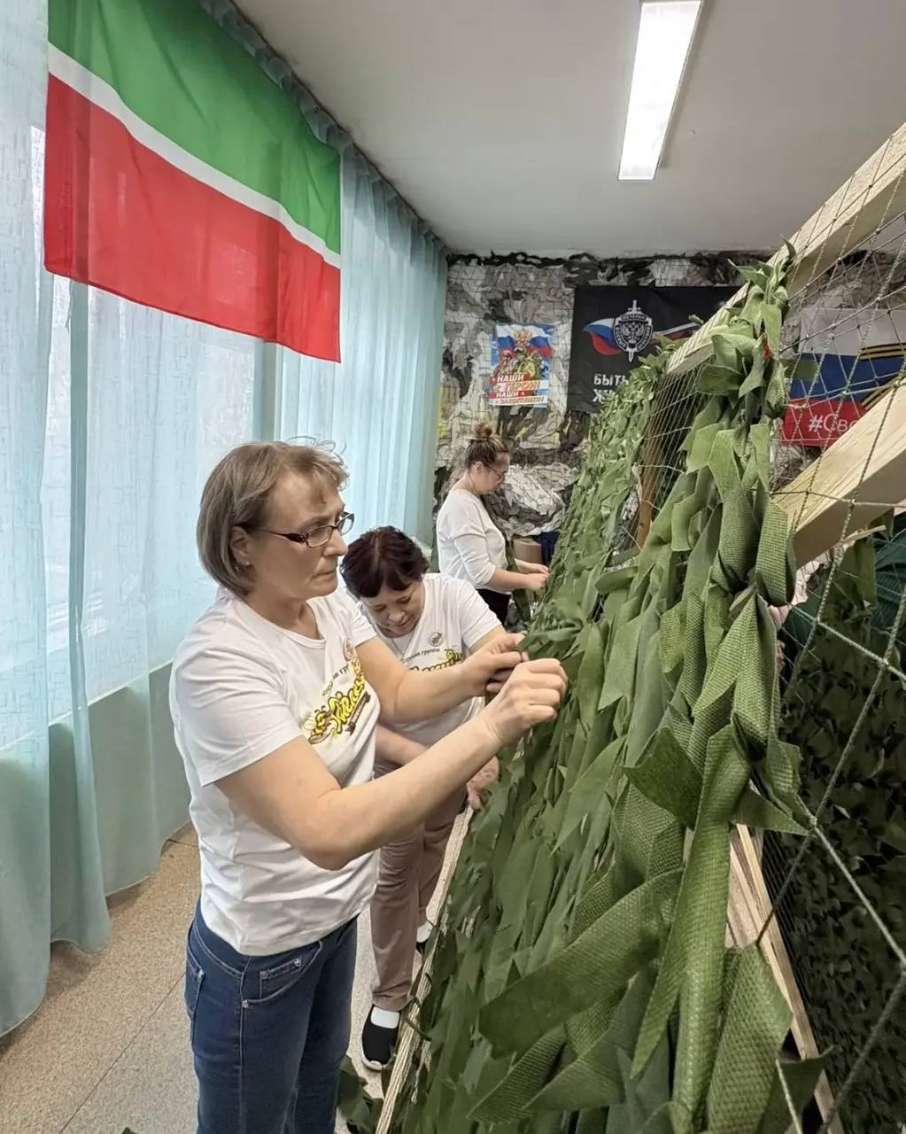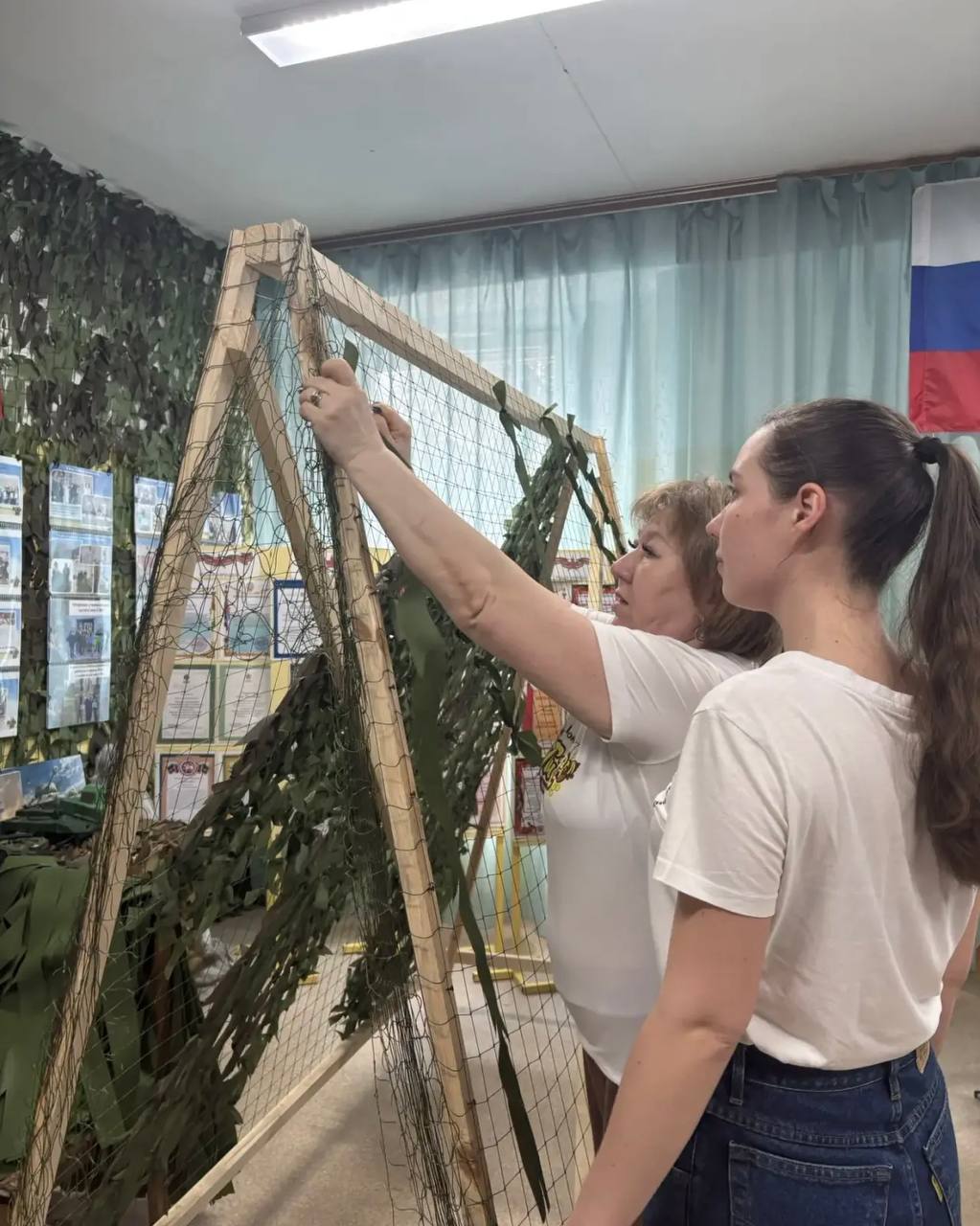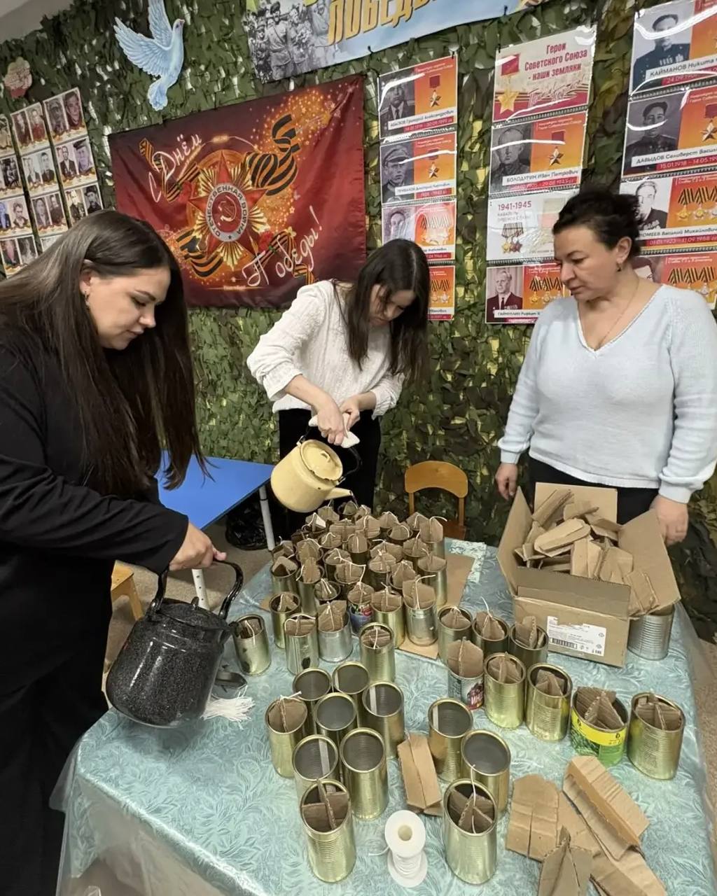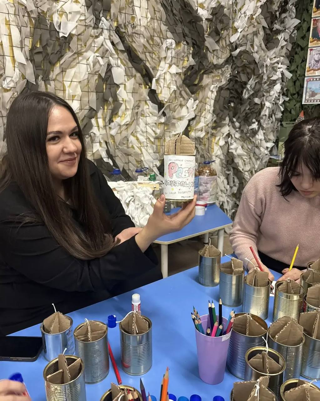 Под руководством опытных «Пчёлок» участники мастеркласса попробовали себя в плетении маскировочных сетей. А волонтёры детского сада №32 показали, как изготавливать окопные свечи.