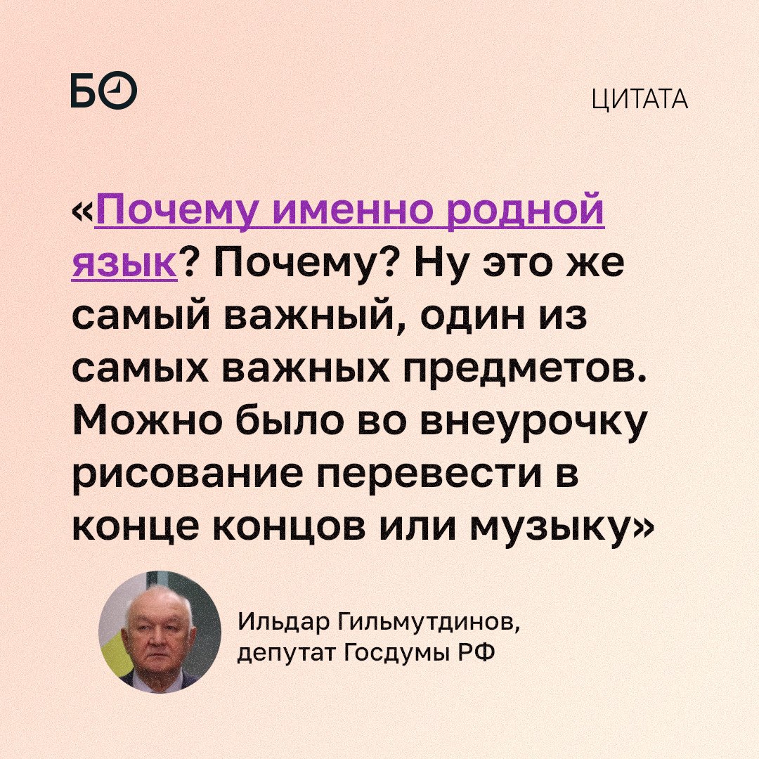 «Неприемлемо, когда в школе сокращаются часы изучения родных языков. Неприемлемо!» — говорил депутат Госдумы Ильдар Гильмутдинов на конференции по многоязычному образованию в Казани. Он не согласен с последними решениями минпросвещения РФ, которые уменьшили объем преподавания родного языка в первых классах. «Мы будем работать [над тем], чтобы впредь никаких таких решений, которые бы каким-то образом уменьшали объем изучения родных языков, не было», — пообещал парламентарий.