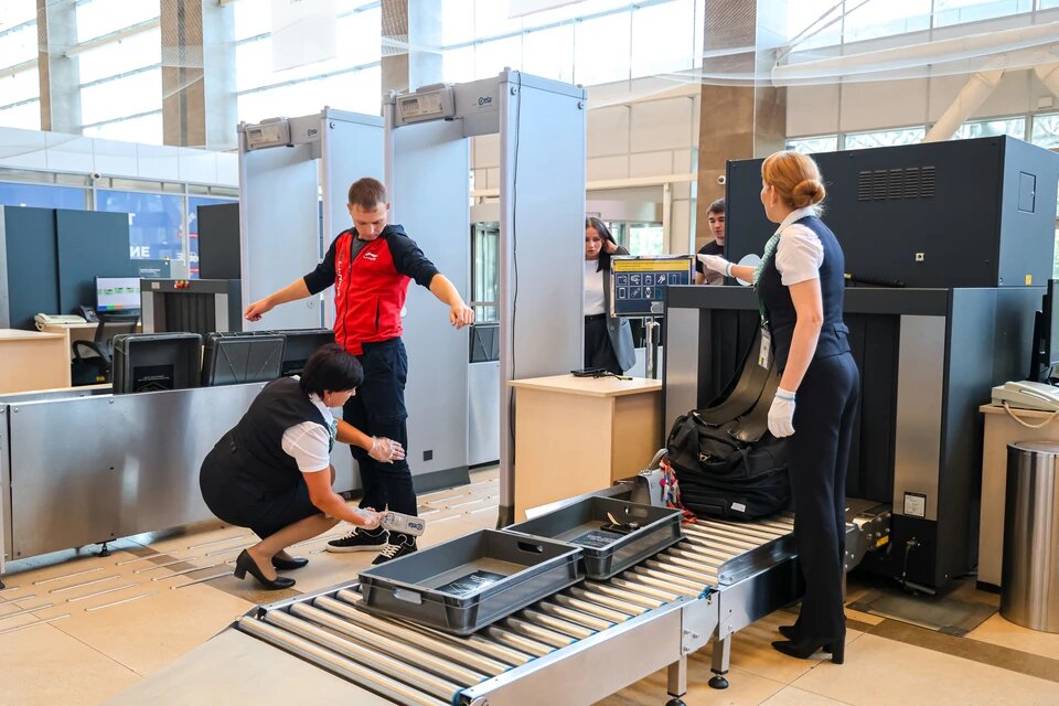 - Процедура: Служба авиационной безопасности проверяет ручную кладь с помощью рентгеновских установок, а пассажиров — металлодетекторами.