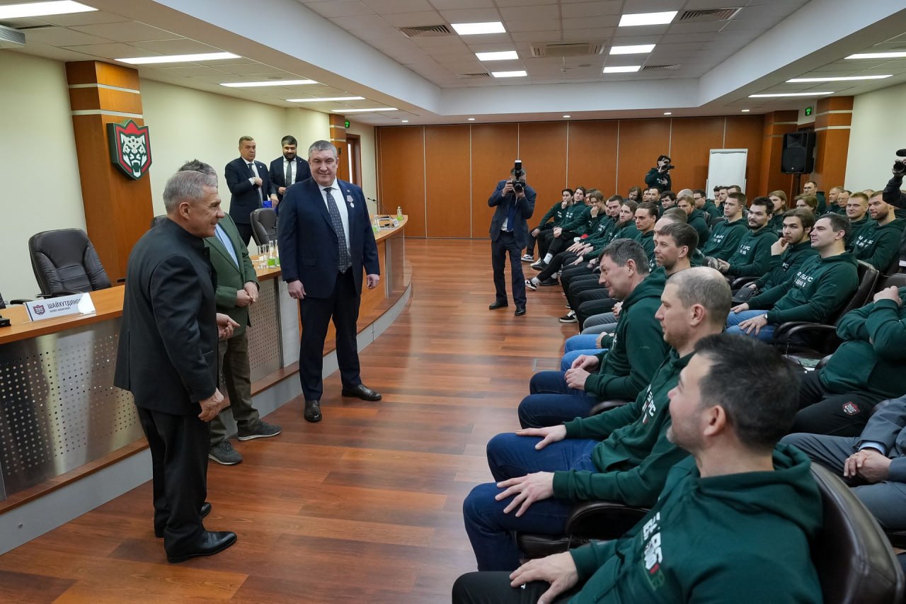 «Игра есть игра, но вы — в плей-офф. За это вам большое спасибо и аплодисменты», — сказал глава РТ. Хоккей, по его словам, имеет в республике особый статус — это важная часть культуры и традиций. Он напомнил о строительстве ледовых катков, в том числе о центре фигурного катания Алины Загитовой, отметив, что там будут заниматься и хоккеем. Минниханов упомянул успехи и «Нефтехимика», тоже вышедшего в плей-офф.