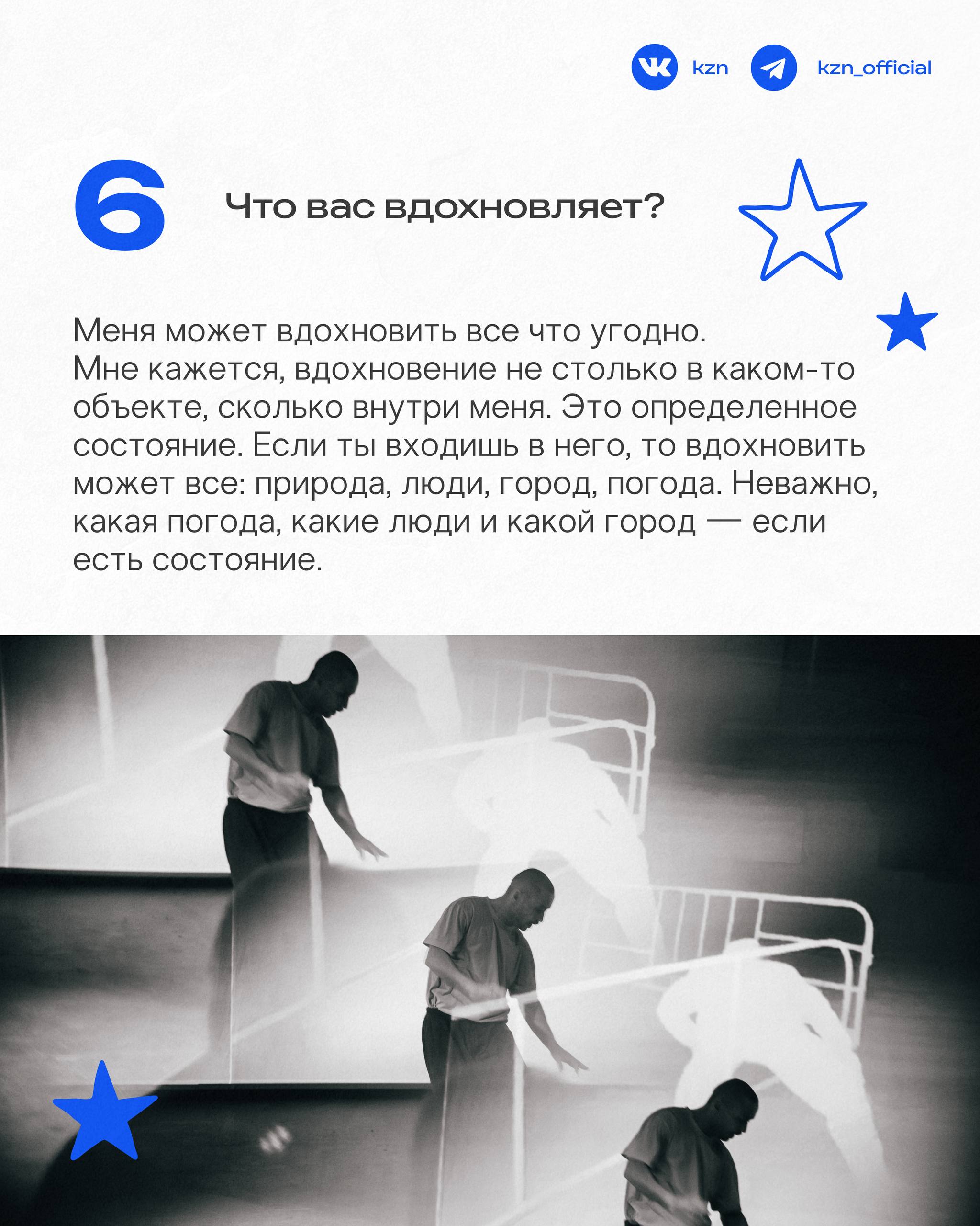Уже более 25 лет Нурбек Батулла через движение говорит о важном — о самоидентичности и сохранении родного языка. Танцовщик, хореограф и лауреат премии Золотая маска, он формирует новый, живой и смелый взгляд на татарскую сцену. Поговорили с Нурбеком о вдохновении, любимых спектаклях в Казани и местах, где можно замедлиться