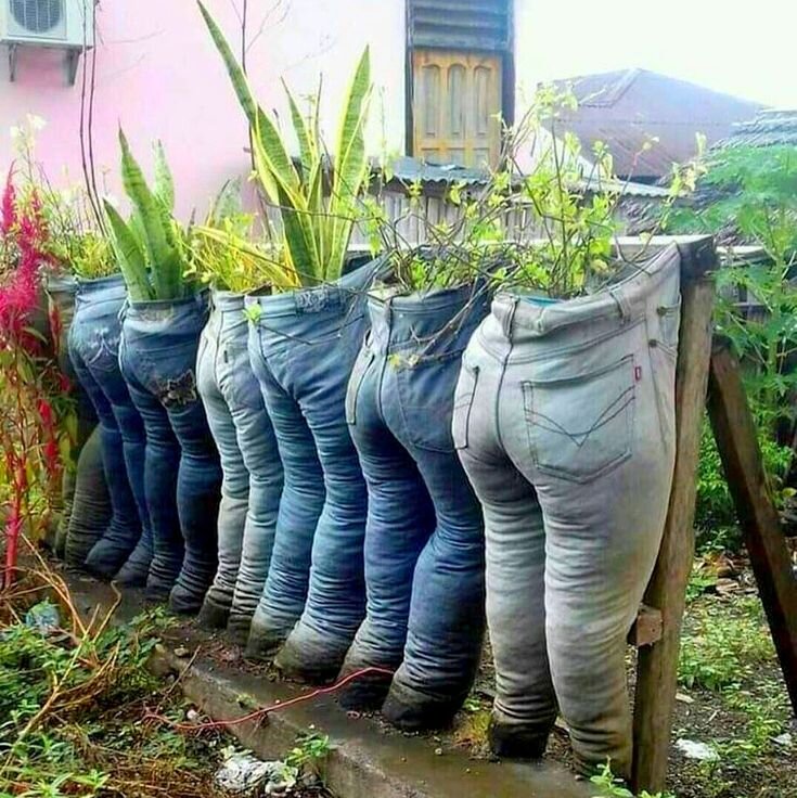 Рачительные хозяева знают: ничего не нужно выбрасывать! Все может найти вторую жизнь в саду, и именно с такой философией созданы «смешные» версии садового дизайна. Например, старые джинсы могут стать необычными кашпо или украшением для заборчика.