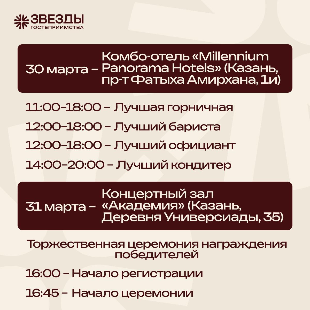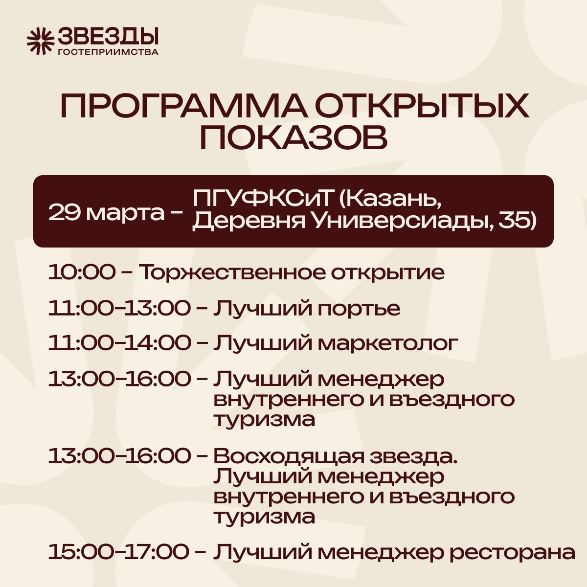С 29 по 31 марта пройдет IV Межрегиональный фестиваль «Звезды гостеприимства». За денежный приз будут соревноваться повара и кондитеры, официанты и бармены, портье и горничные, бариста, менеджеры туризма, маркетологи, блогерыгиды, студенты и старшеклассники — будущие звезды отрасли.
