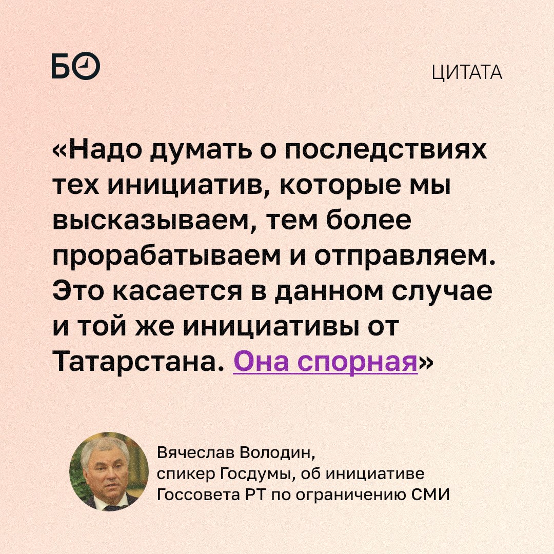 Володин добавил, что предложение сначала надо было обсудить в регионе, с гражданским обществом и экспертами, а потом уже «формировать повестку» и выносить на уровень Думы. По его словам, инициативу Госсовета РТ в Госдуме пока не рассматривают и, возможно, рассматривать не будут. Он отметил, что информация подается так, будто документ уже направлен в Госдуму, хотя на самом деле он передан в совет законодателей на экспертизу. «И в рамках этой экспертизы обсуждается законодательная инициатива, которая пока еще даже по статусу таковой не стала», — пояснил Володин.