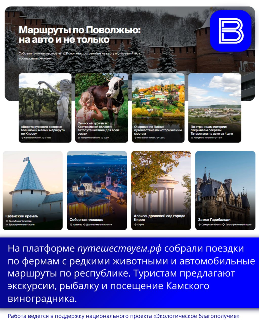 Среди маршрутов — автопутешествие «По страницам истории: открываем секреты Татарстана на авто за 4 дня» с посещением единственного в регионе виноградника в Камском Устье (более 120 сортов столового винограда). Также в рамках пятидневного автотура «От живописного Лаишева до Елабуги» туристы могут посетить рыболовный комплекс в Лаишевском районе, где разводят форель, стерлядь и осетра.