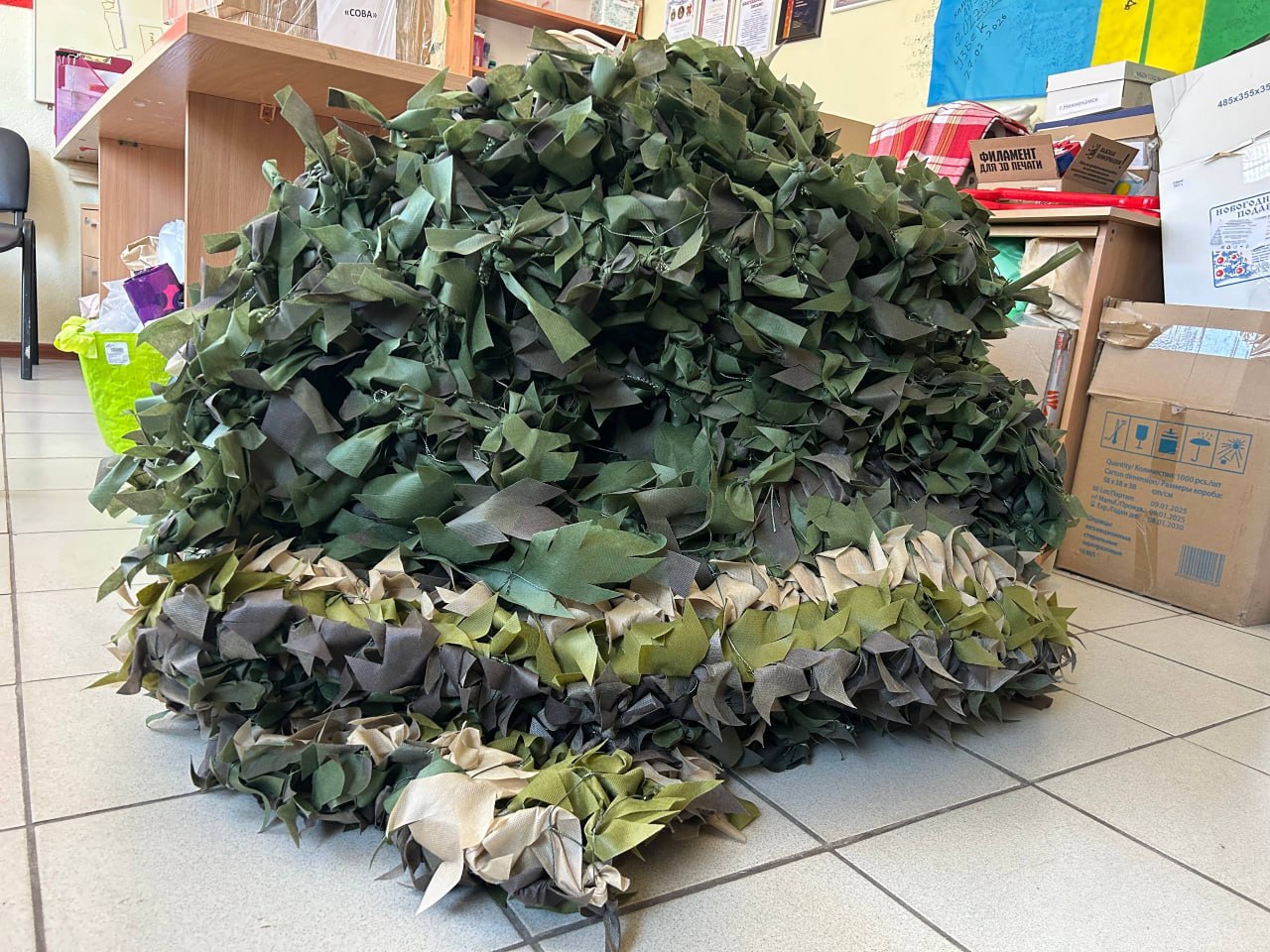 Коллектив и родители 60-го садика помогают волонтёрам не только деньгами, но и готовыми изделиями. Только за последний месяц они сплели четыре камуфляжные сетки. Об их необходимости знают из первых уст. Среди воспитанников — трое детей действующих участников СВО, папа ещё одного ребёнка уже является ветераном боевых действий.