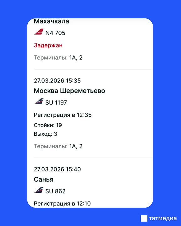 По данным онлайн-табло, в аэропорту столицы Татарстана задерживаются рейсы в Москву, Санкт-Петербург, Махачкалу, Минеральные Воды, Сочи и другие города, а вылет в Стамбул отменен.