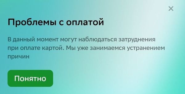 «В данный момент могут наблюдаться затруднения при оплате картой. Мы уже занимаемся устранением причин», — говорится в уведомлении, которое появилось в мобильном приложении Сбера.