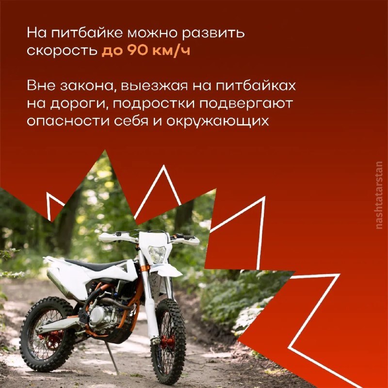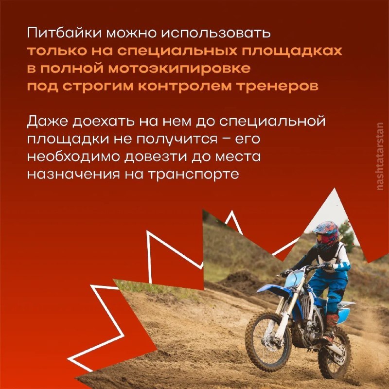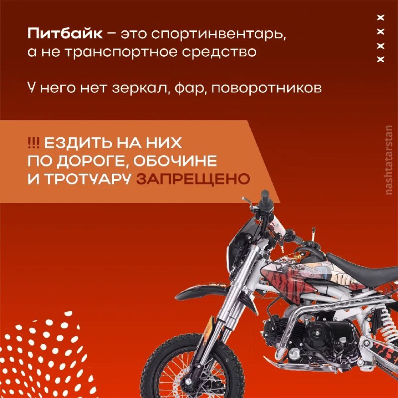 Питбайк – это спортинвентарь, а не транспорт. Выезд на дороги, обочины и тротуары запрещён.