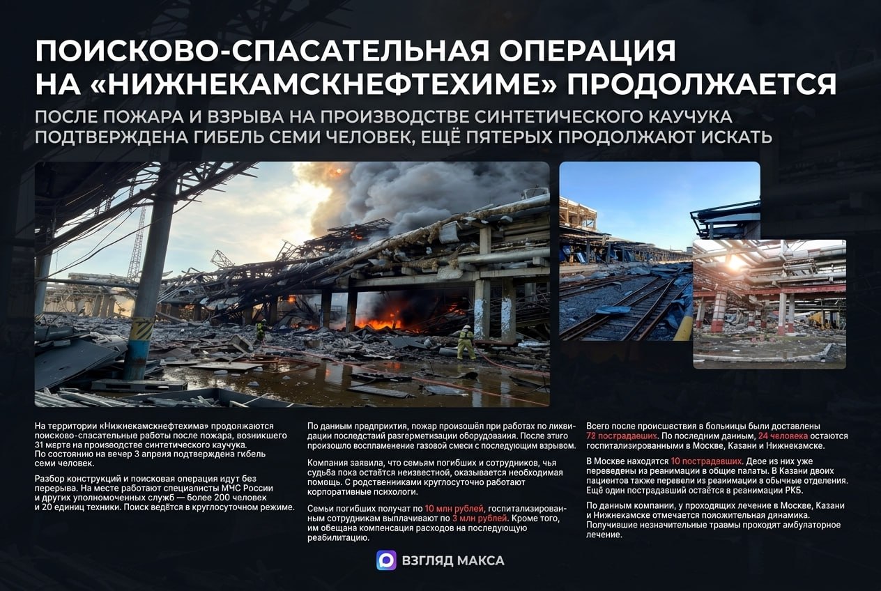 На территории «Нижнекамскнефтехима» продолжаются поисково-спасательные работы после пожара, возникшего 31 марта на производстве синтетического каучука. По состоянию на вечер 3 апреля подтверждена гибель семи человек, поиски ещё пяти продолжаются. Об этом сообщила компания.