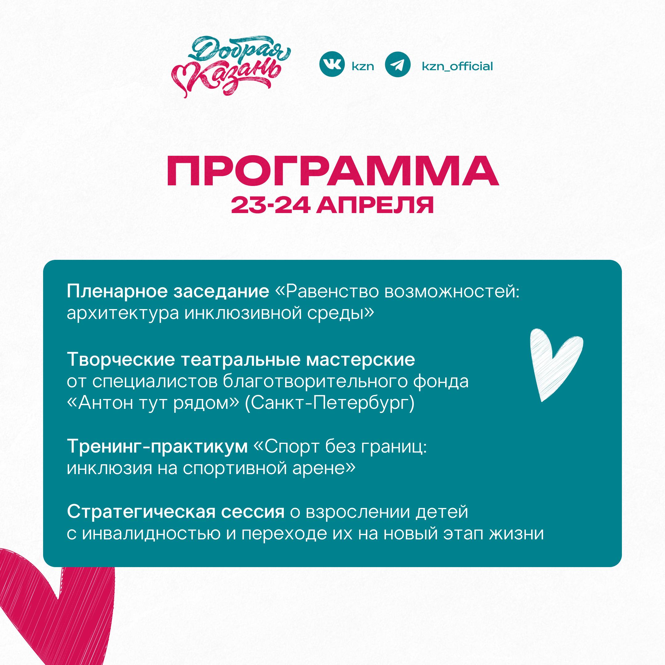 С 23 по 24 апреля в ЦКС «Московский» пройдет Международный форум «Добрая Казань. Инклюзия как новая социальная норма». 250 участников из разных регионов России и других стран соберутся, чтобы обсудить развитие инклюзивной среды, социализацию и трудовое воспитание людей с ментальной инвалидностью, их взросление и методы развития самостоятельности.