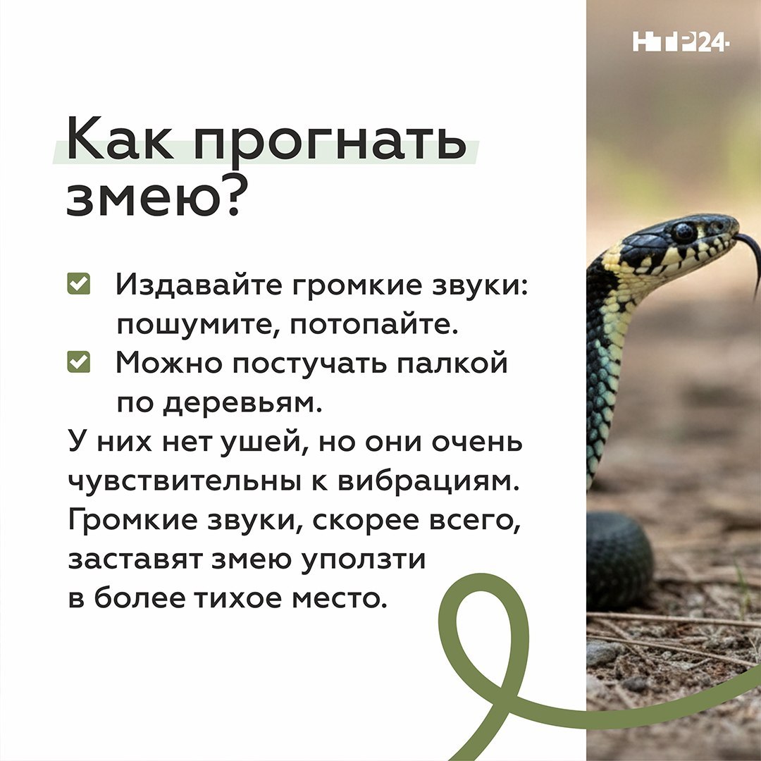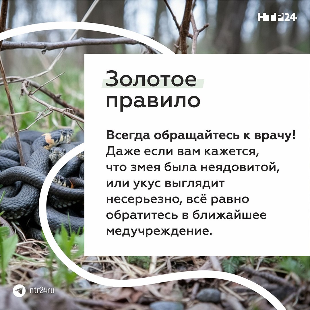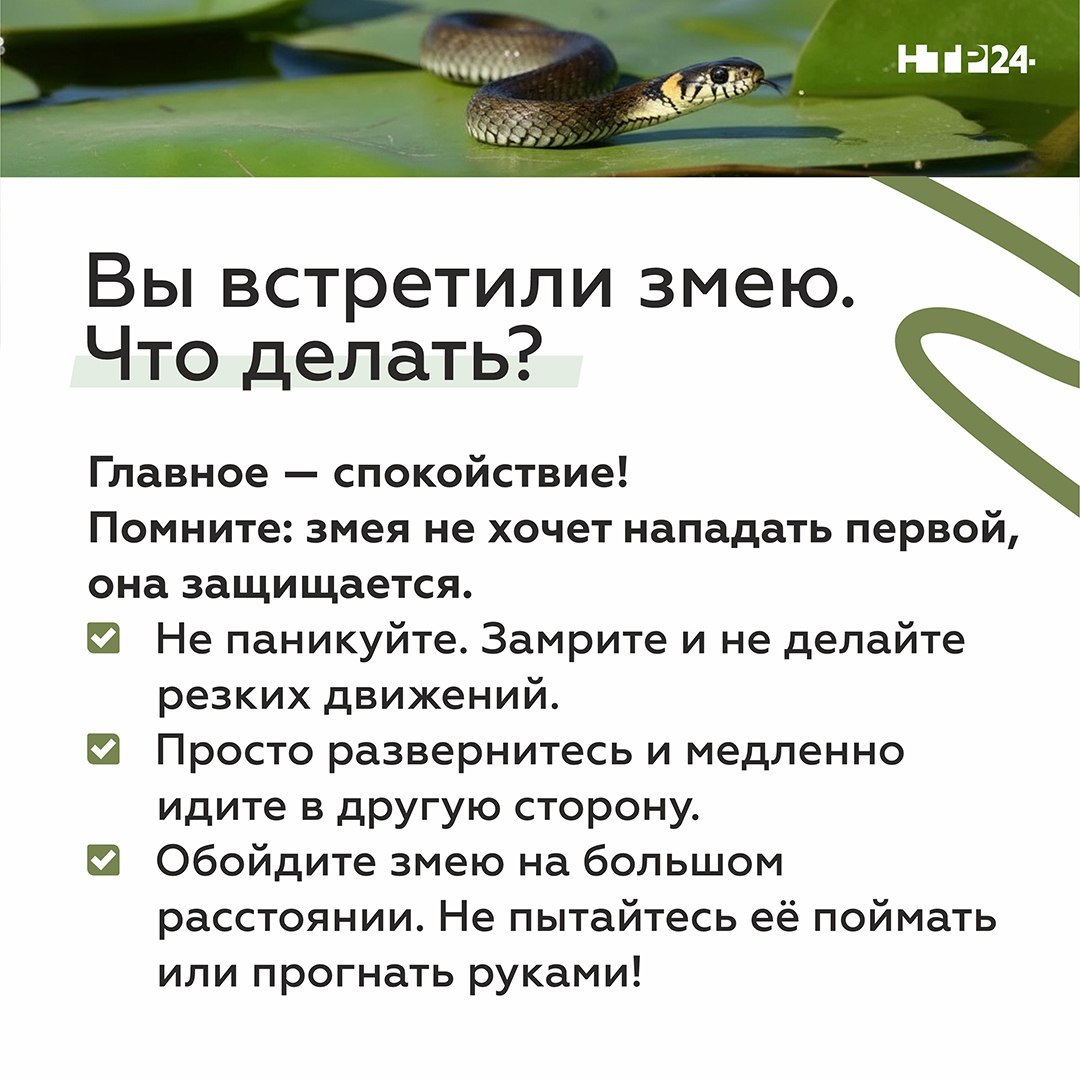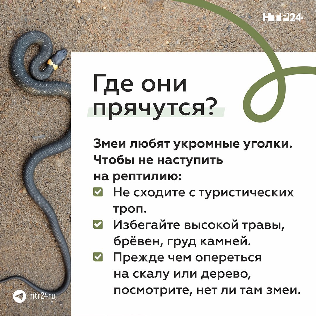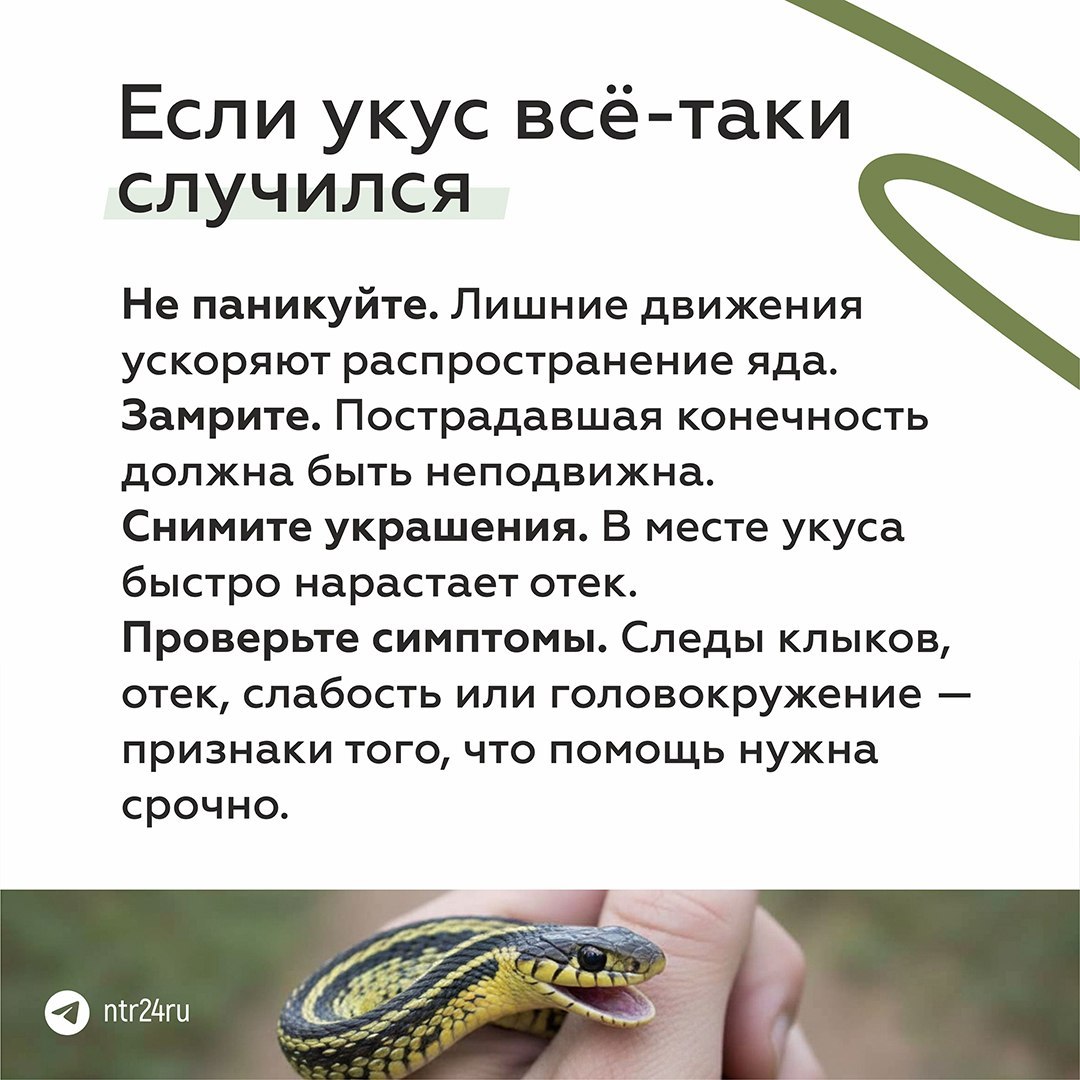 Где обычно прячутся змеи, что взять с собой в лес или на дачу, как вести себя при встрече со змеёй и что делать при укусе — об этом в карточках