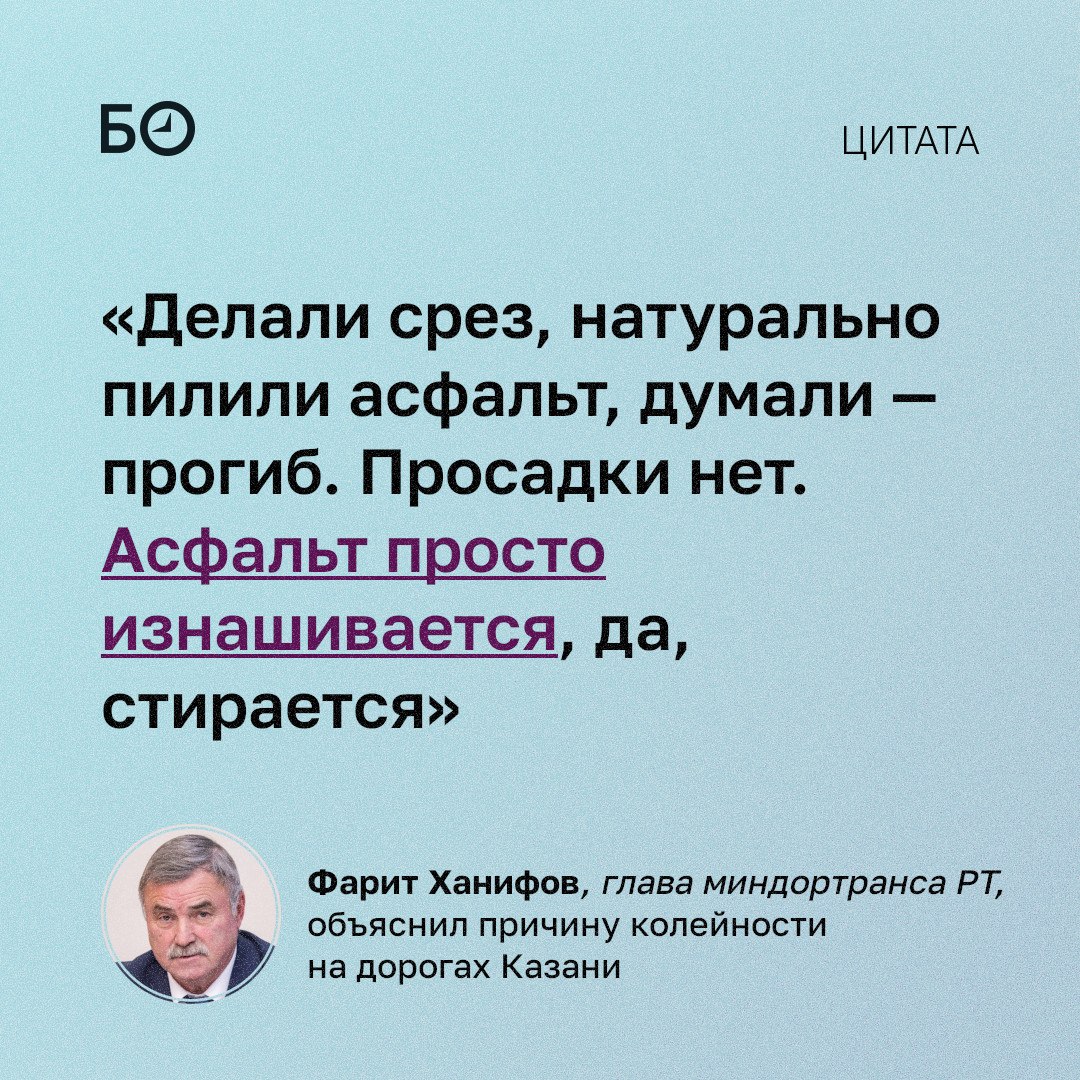 Глава миндортранса РТ Фарит Ханифов объяснил причину колейности на дорогах Казани — она образуется из-за стирания асфальта от колес легковых автомобилей.