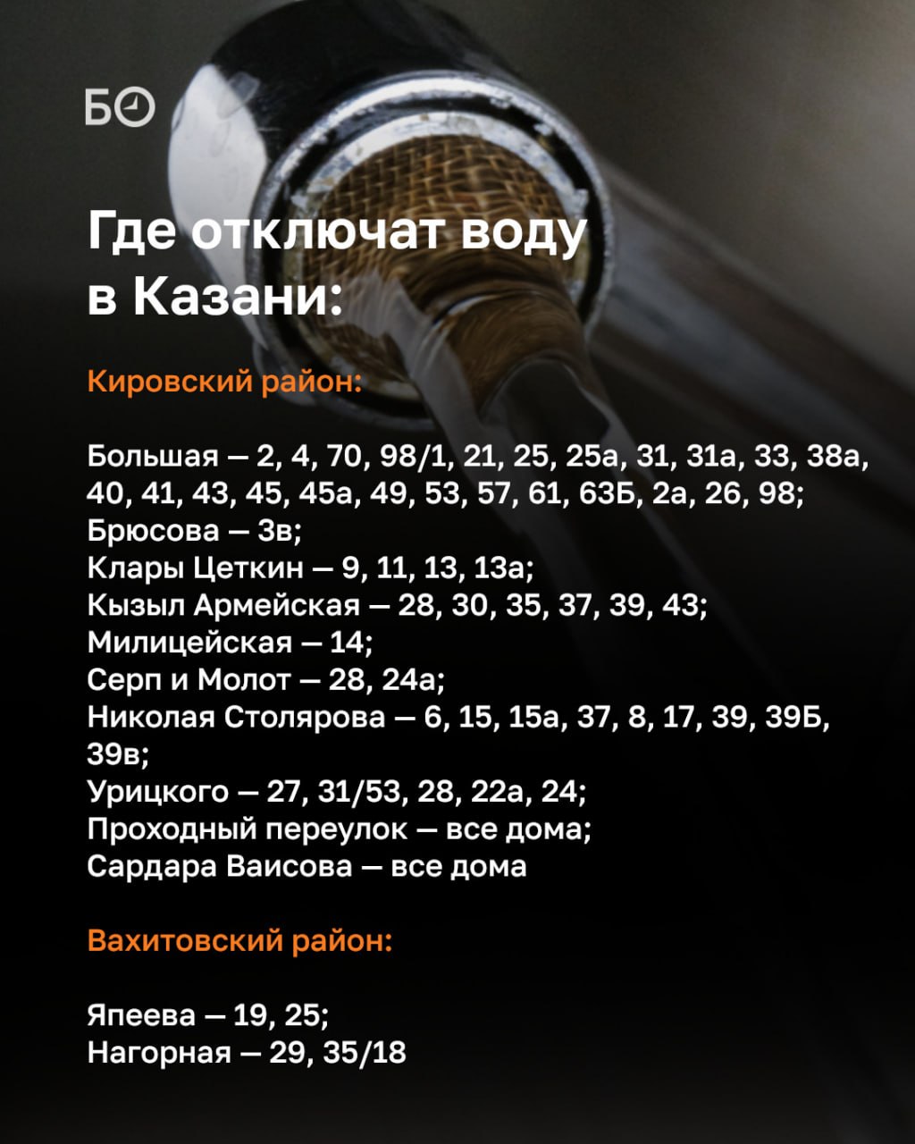 В Кировском и Вахитовском районах Казани сотни объектов временно останутся без воды из-за работ на водопроводе.