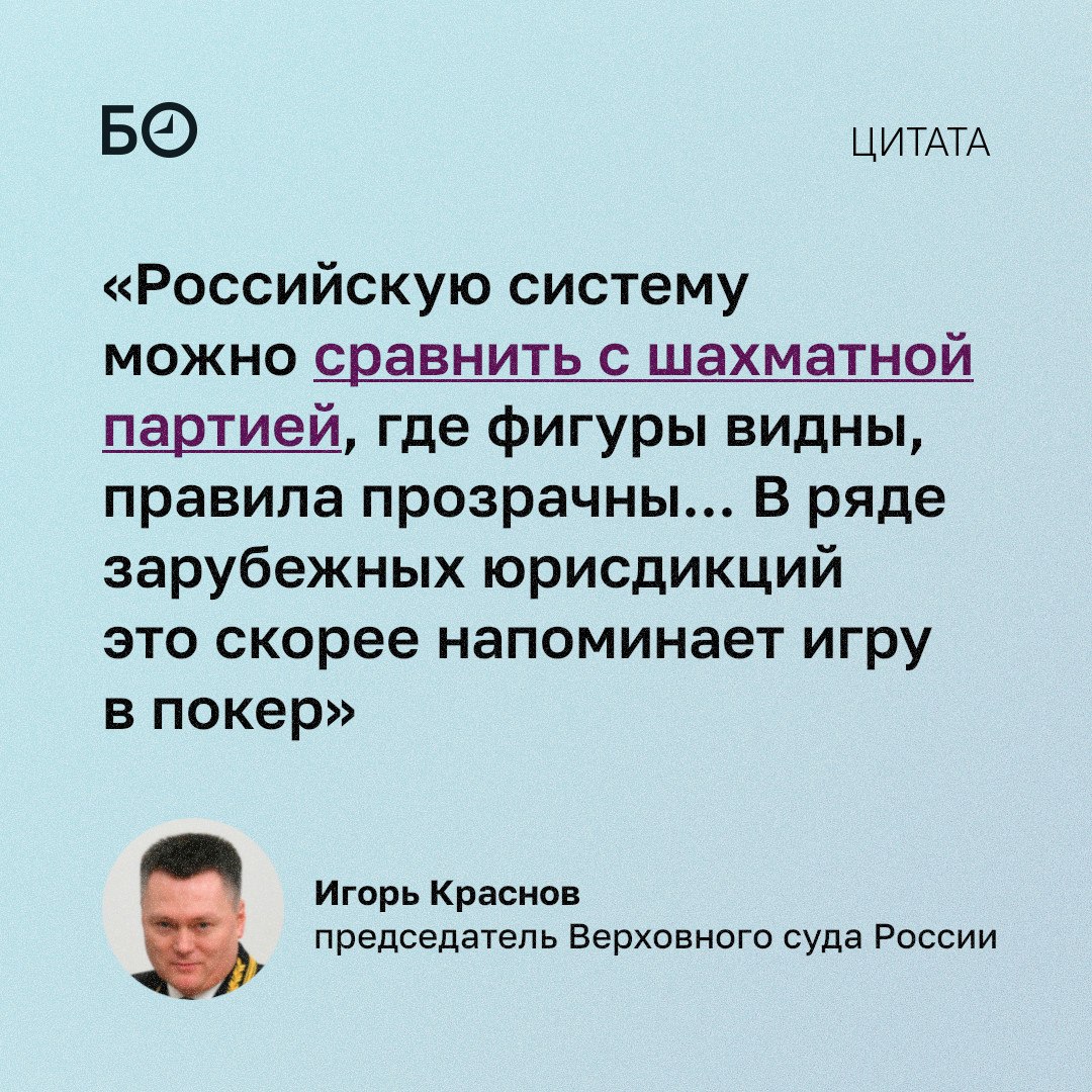 «Российскую систему можно сравнить с шахматной партией, где фигуры видны, правила прозрачны, поле для принятия решений ограничено четкой логикой. Однако в ряде зарубежных юрисдикций это скорее напоминает игру в покер. Нередко ключевую роль там играют заранее подготовленная стратегия, доказательственные, порой граничащие с шулерством маневры и даже эффект неожиданности», — сказал он.