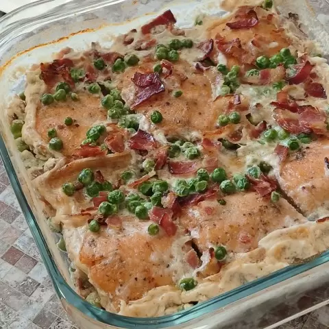 Рыба в сливочном соусе, дополненная хрустящим беконом и нежным зелёным горошком, – это шикарное блюдо, способное стать изюминкой как повседневного ужина, так и праздничного стола. Элегантное сочетание текстур и вкусов удовлетворит даже самых взыскательных гурманов.