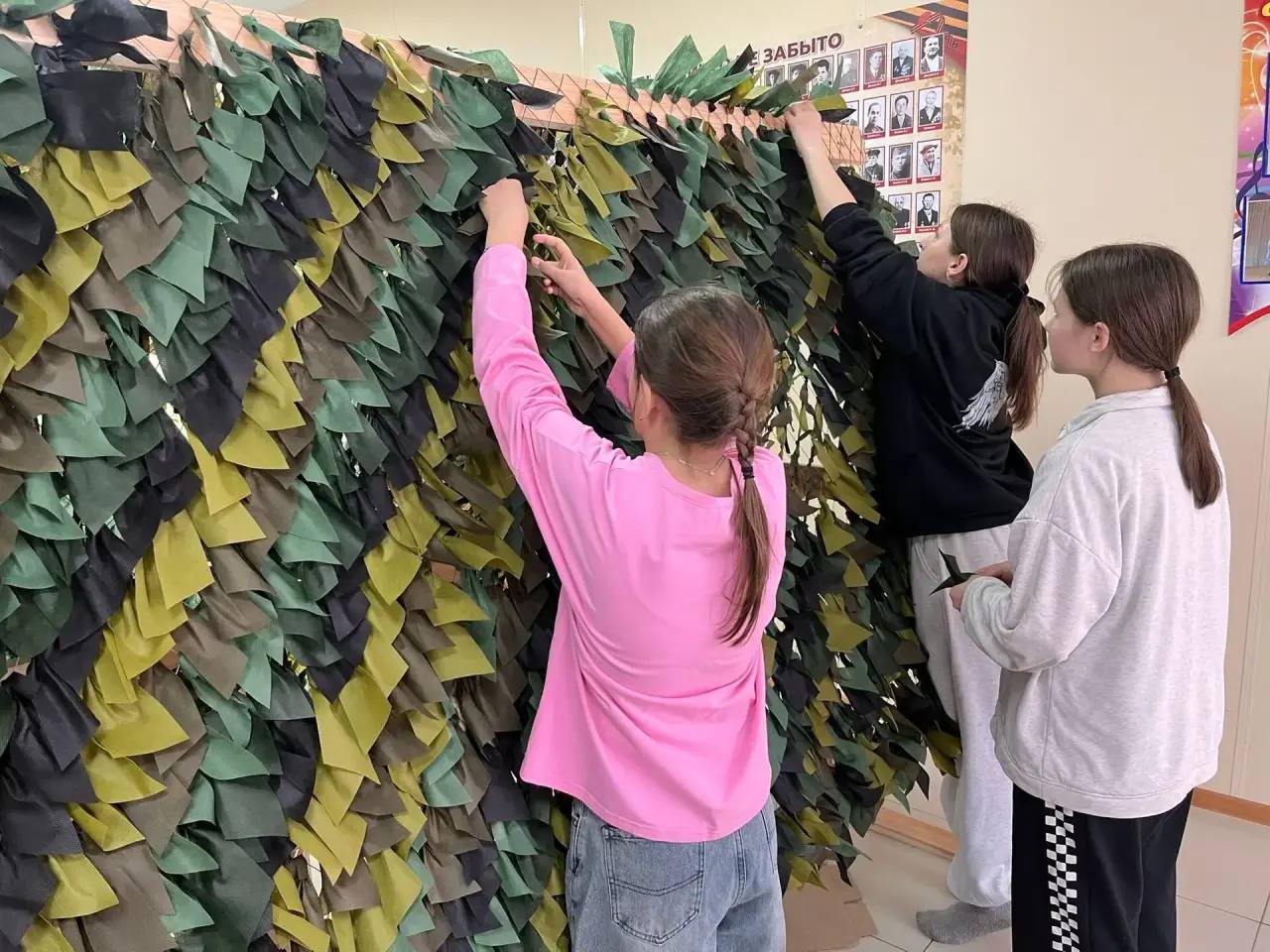 В Кайбицком районе ученики и учителя Хозесановской школы совместно с волонтерами изготавливают маскировочные сети для наших военнослужащих.