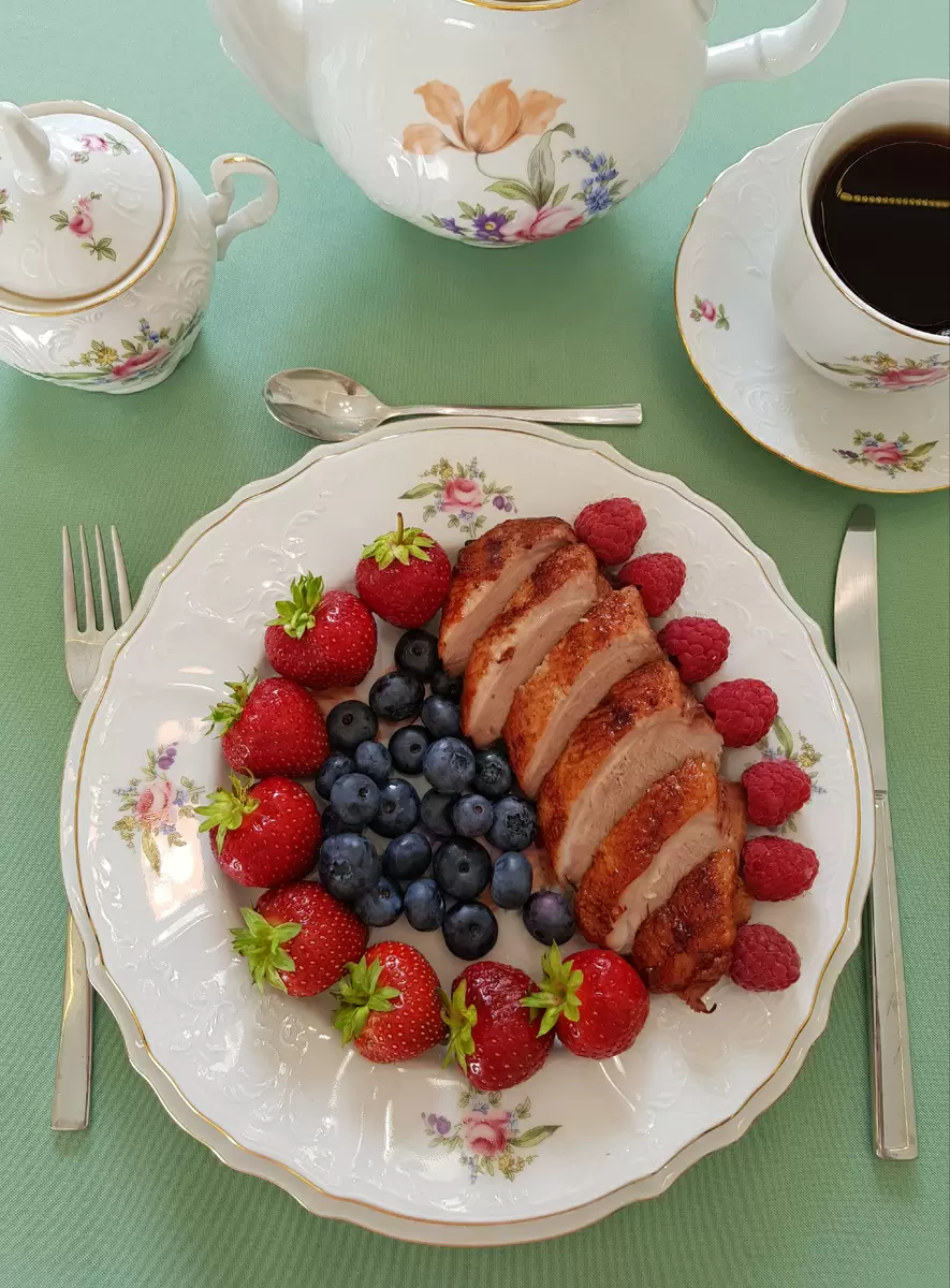 Готовую утку нарежьте тонкими ломтиками под углом и подавайте на красиво оформленных тарелках. Украсить блюдо можно свежими ягодами — клубникой, голубикой и малиной, что добавит ярких акцентов и сделает подачу более аппетитной.