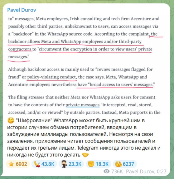 Также он приложил публикацию СМИ о судебном иске к Meta**, владеющей WhatsApp*. В январе 2026 года группа международных истцов подала иск против компании, утверждая, что мессенджер и его материнская структура якобы «хранят, анализируют и могут получать доступ практически ко всем частным сообщениям пользователей».