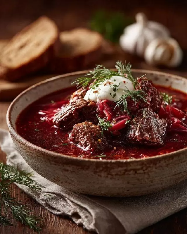 Начинается всё с приготовления бульона: мяса заливают холодной водой и доводят до кипения, а затем очищают от пены и добавляют лук. Как только бульон настаивается, переходят к овощам. Свеклу и морковь следует нарезать или натереть и обжарить с луком, добавляя уксус и сахар для сохранения цвета. Затем всё это смешивается с бульоном и томится в разогретой духовке.