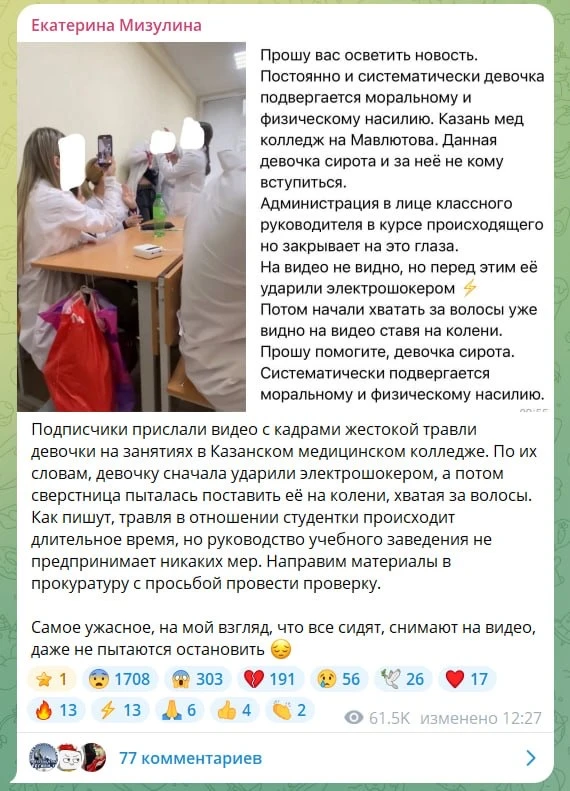 В Казанском медколледже опровергли сообщение Екатерины Мизулиной о буллинге в учреждении. Ранее глава лиги безопасного интернета в соцсетях сообщила, что в учреждении якобы жестоко избивают девушку, а руководство не реагирует.