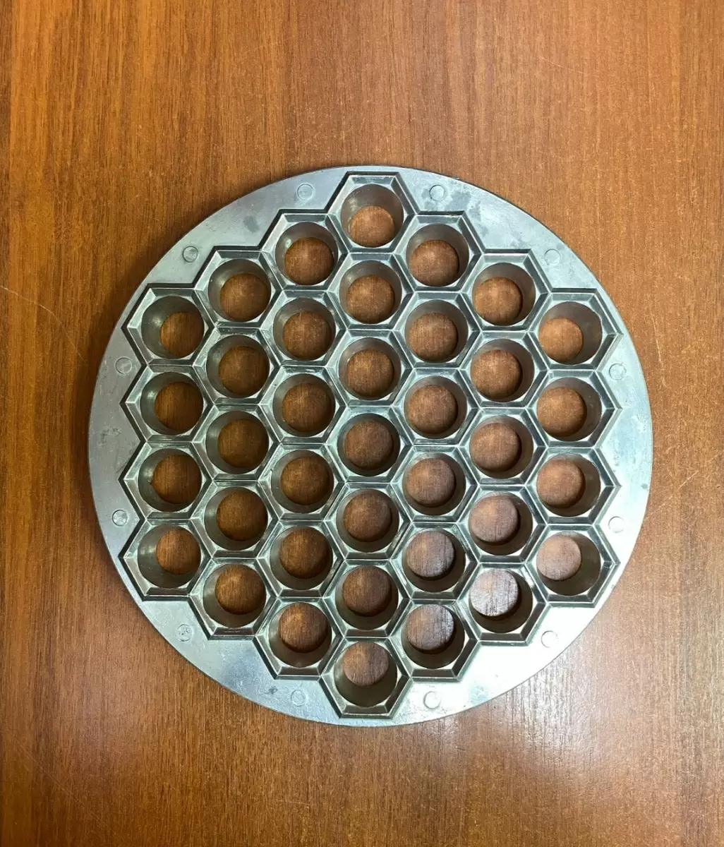 Края ячеек скошены под углом 3-5 градусов, что не случайно: такой дизайн позволяет пельменям легко вытаскиваться из формы. А вот в пластиковых вариантах приходится выкручивать пельмени руками. Также стоит упомянуть, что исследования 1970-х показали, что при правильной термообработке алюминий образует защитный оксидный слой, обеспечивающий долговечность и устойчивость к коррозии. Благодаря этому пельменница хранится в идеальном состоянии даже после многих лет использования.