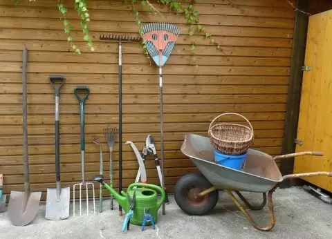 - Держатели для садового инвентаря: ПВХ трубы помогут надежно зафиксировать лопаты и грабли на стене, освобождая пол от лишних предметов.