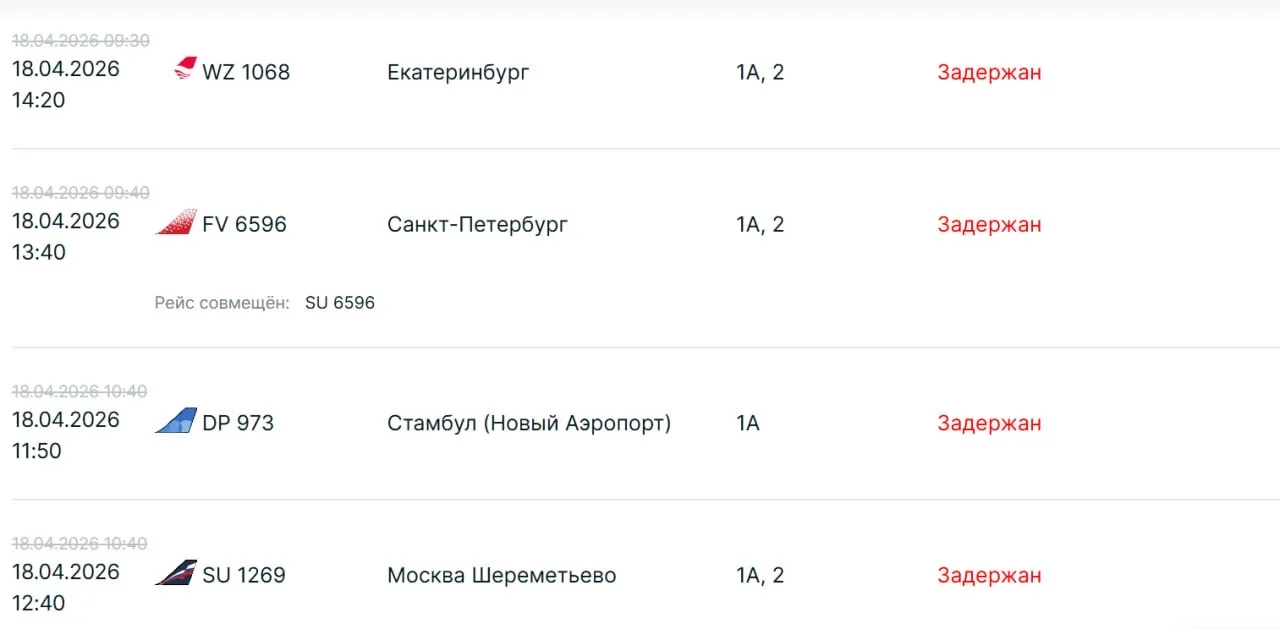 На 4 часа перенесли вылет из Стамбула, на 6 часов — из Душанбе и Екатеринбурга, почти на 5 часов — из Алматы, на 3 часа — из Нового Уренгоя и Перми, почти на 7 часов — из Барнаула. Два рейса из Дубая также отменили.