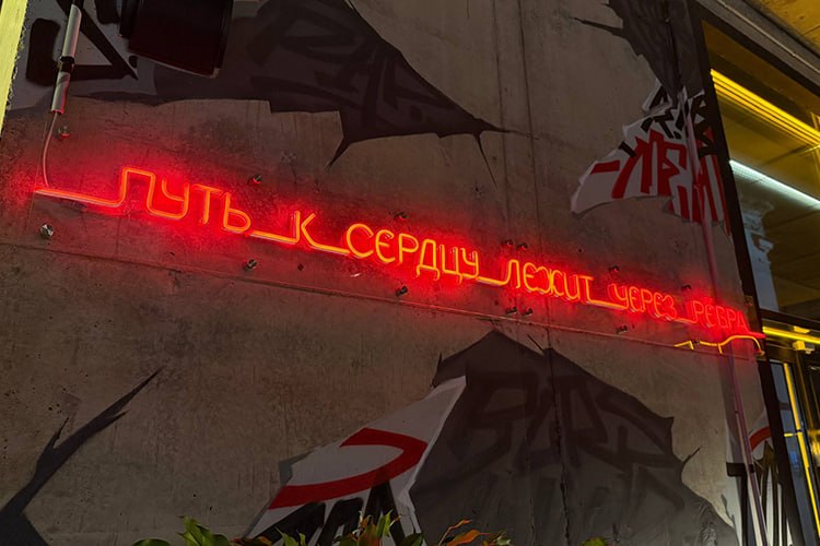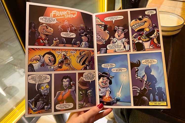 Внутри — брутальный лофт с англоязычным рэпом, шумными разговорами и смехом из разных углов. Посадка плотная, но не давит, а создает ощущение общего пространства, где все на одной волне. Меню выглядит как арт-объект — полноценная газета с намеренно перегруженной версткой. Барная карта — отдельный 8-страничный документ.