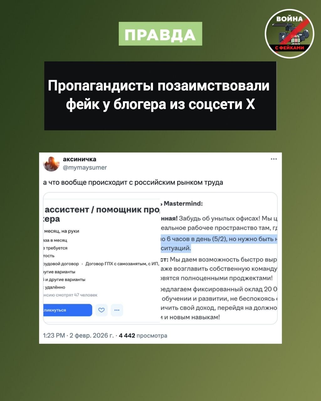 Пропагандисты даже не сами нашли объявление, скриншоты которого растиражировали. Первой внимание на «интересную» вакансию обратила россиянка, уехавшая в Германию. Девушка 2 февраля 2026 года спросила у подписчиков: «А что вообще происходит с российским рынком труда».