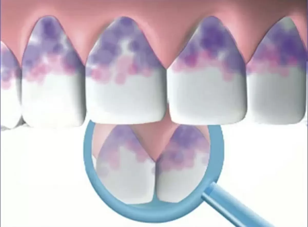 - Один цвет показывает старые образования, а другой — новые. Это позволяет самостоятельно улучшить гигиену в окрашенных зонах, в то время как старые отложения требуют вмешательства стоматолога.