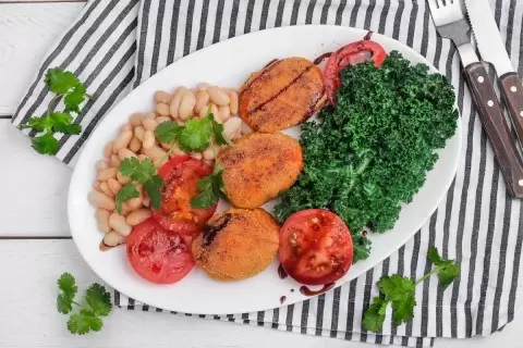 Обжаривание биточков: Обваляйте котлеты в семоле и обжаривайте их на разогретой сковороде с растительным маслом по 3-4 минуты с каждой стороны до золотистой корочки. На другой сковороде разогрейте масло, добавьте кейл и фасоль, посолите и добавьте немного воды. Тушите 2-3 минуты под крышкой. Подавая, добавьте к котлетам свежие помидоры и соус Наршараб для легкого обновления вкуса.