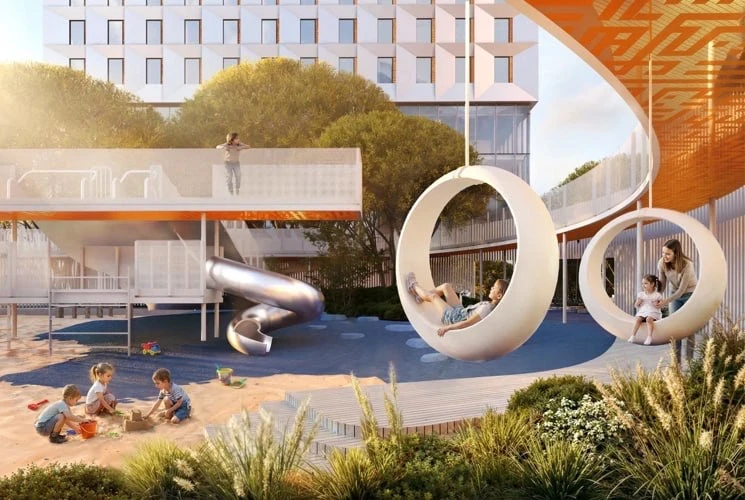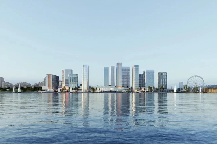 Проект рядом с «Ривьерой» задуман как многофункциональный кластер — с жильем, офисами, отелями, торговыми и сервисными пространствами. Всего запланировано 13 корпусов с единым стилобатом.
