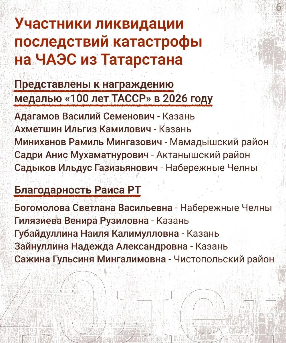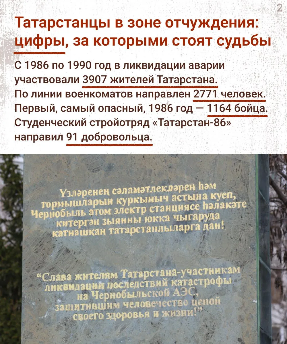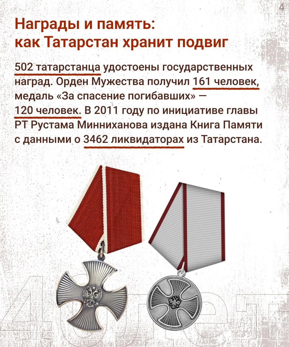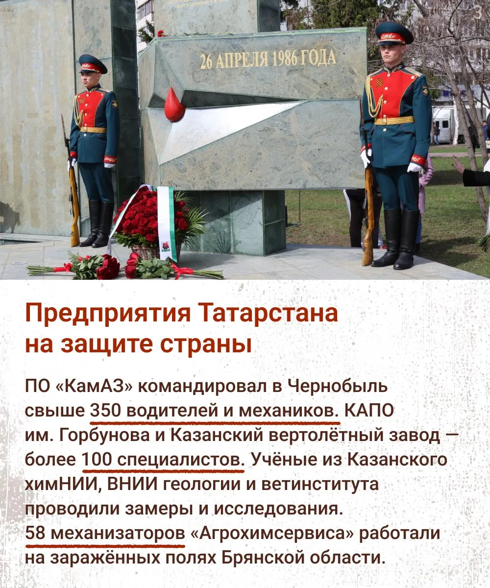В карточках — история трагедии на Чернобыльской АЭС и вклад Татарстана в ликвидацию последствий. 3907 наших земляков прошли через ад, чтобы спасти страну. Помним. Чтим. Гордимся.
