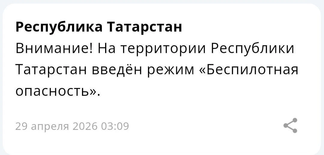 Кроме того, объявлена угроза атаки БПЛА на Нижнекамск, Альметьевск и Елабугу.Параллельно с этим временно не принимают и не отправляют рейсы аэропорты Казани, Нижнекамска и Бугульмы.