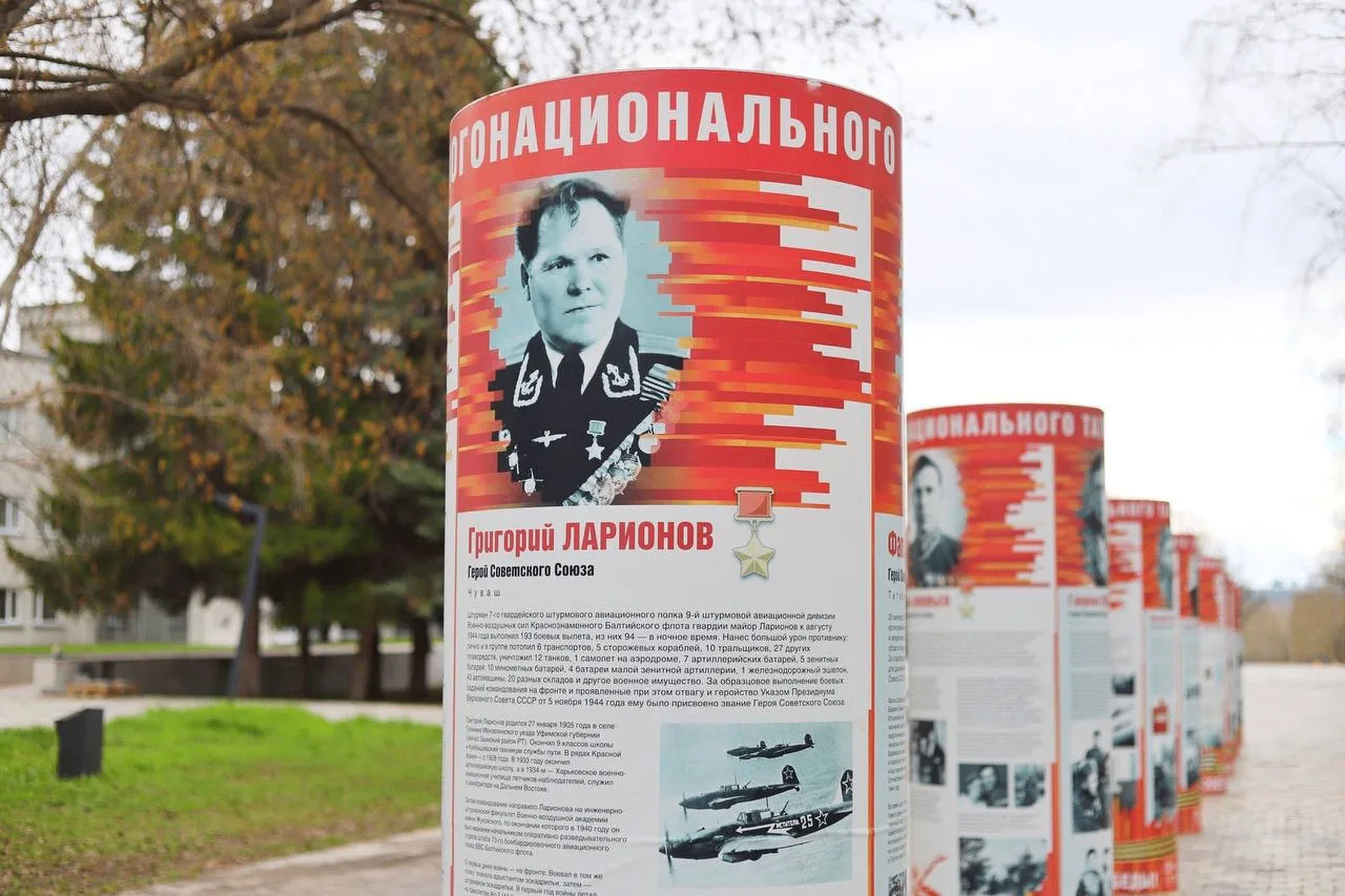 Возле Дома народного творчества представлены истории наших земляков, внесших вклад в Победу в Великой Отечественной войне. Это 42 судьбы, за каждой из которых — мужество, подвиг и настоящая любовь к своей стране.
