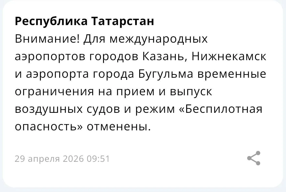 Аэропорты Казани, Нижнекамска и Бугульмы открыли спустя почти 6 часов. Вместе с тем в РТ отменили беспилотную опасность.