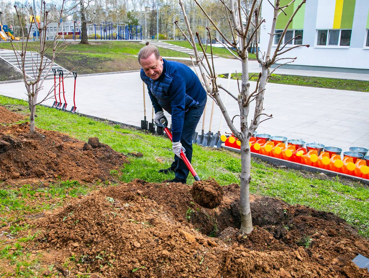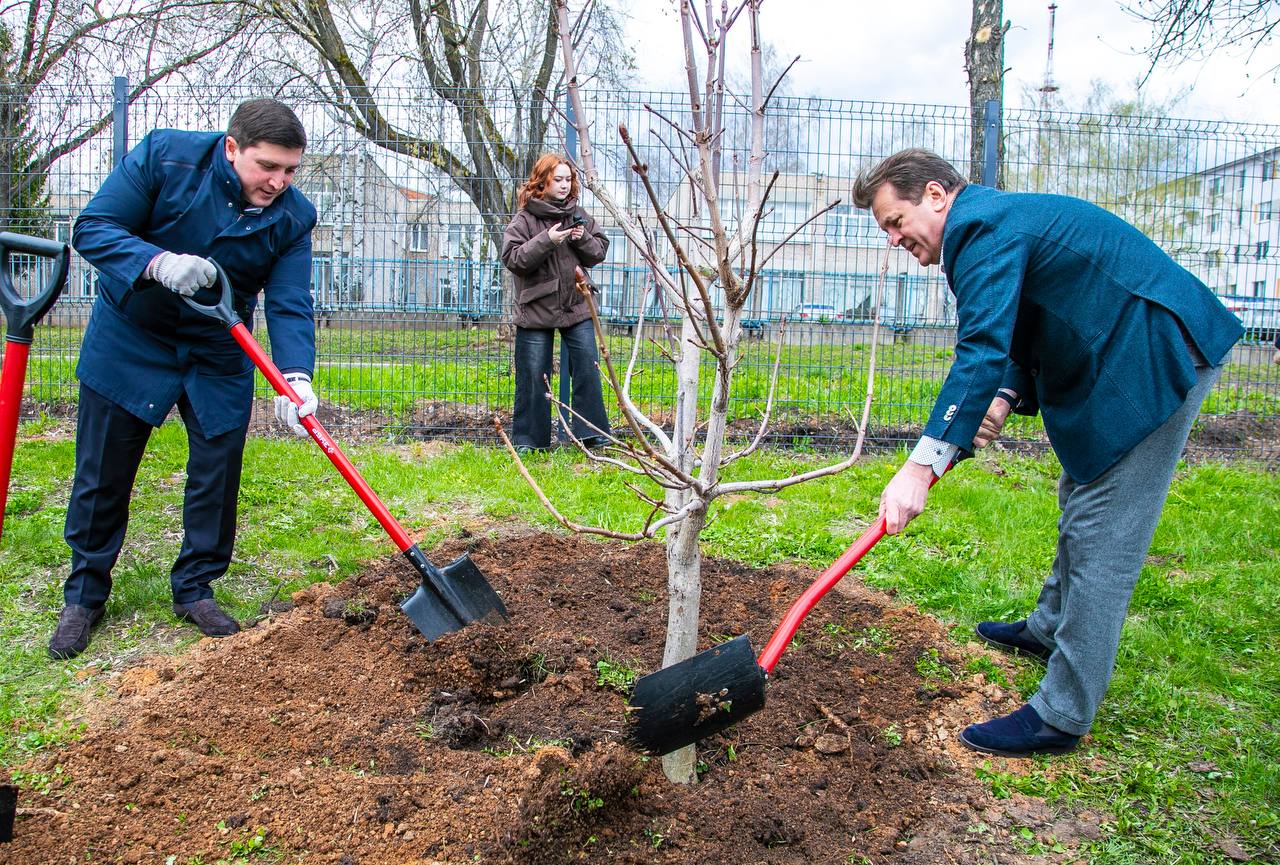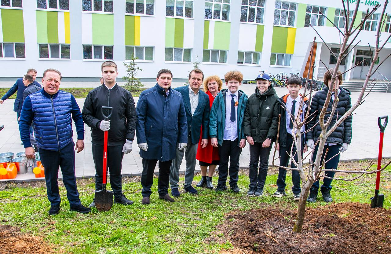 12 саженцев каштана высадили вместе с учениками, и почетными выпускниками этой школы — с мэром Казани Ильсуром Раисовичем Метшиным и депутатом Госдумы РФ Айдаром Раисовичем Метшиным.