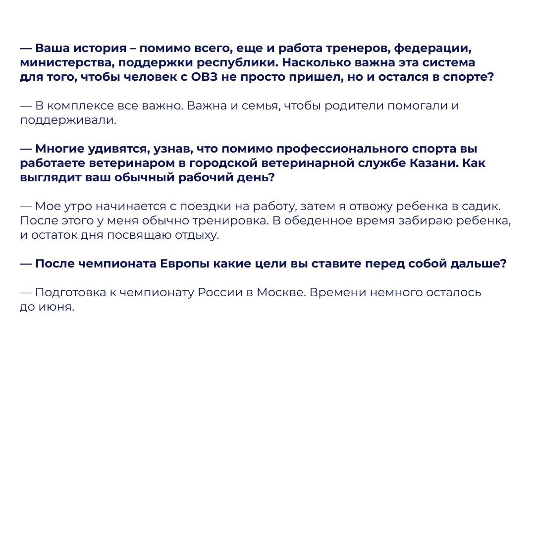Личная история спортсмена – драйвер для развития адаптивного спорта в республике, который сегодня поддерживается государственной программой «Развитие физической культуры и спорта». Системная работа помогает создавать условия для людей с ОВЗ и вдохновлять новые поколения.