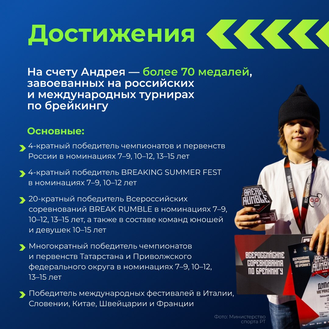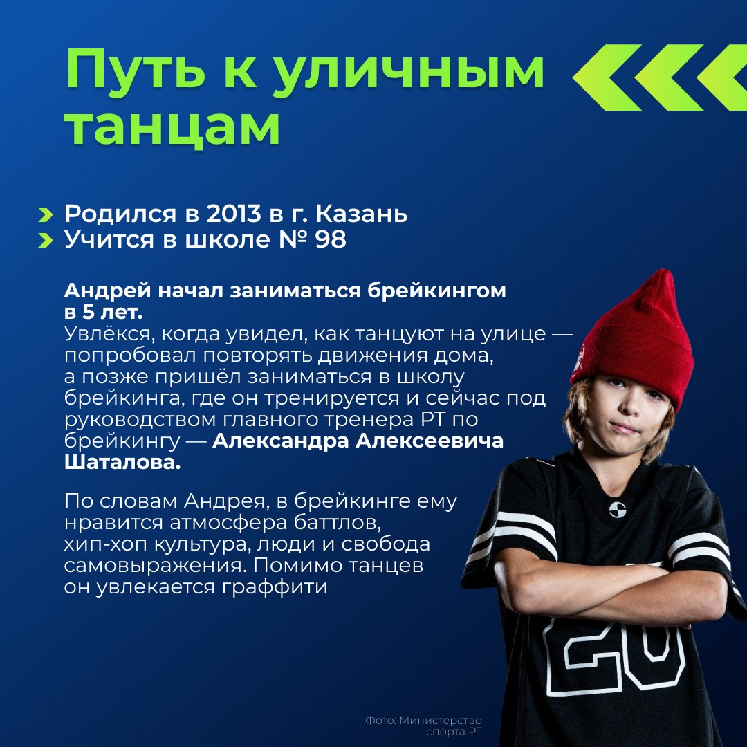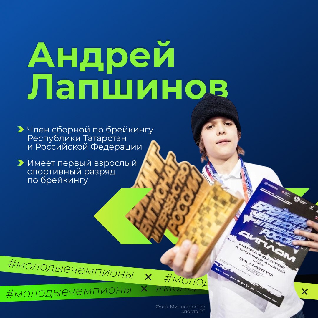 Сегодня в рубрике #молодыеспортсмены рассказываем об Андрее Лапшинове — члене сборных Татарстана и России по брейкингу.